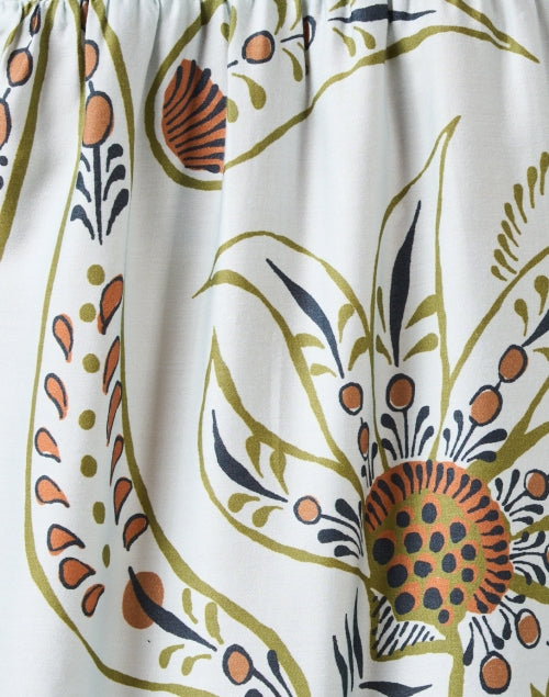 Omika’s Anouk top is a feminine favorite, featuring a striking floral motif in earthy tones against a soft blue background. Designed with a split neckline, tasseled ties, and smocked cuffs, it balances bohemian ease with refined detail. Lightweight and versatile, this blouse pairs effortlessly with both denim and tailored separates.