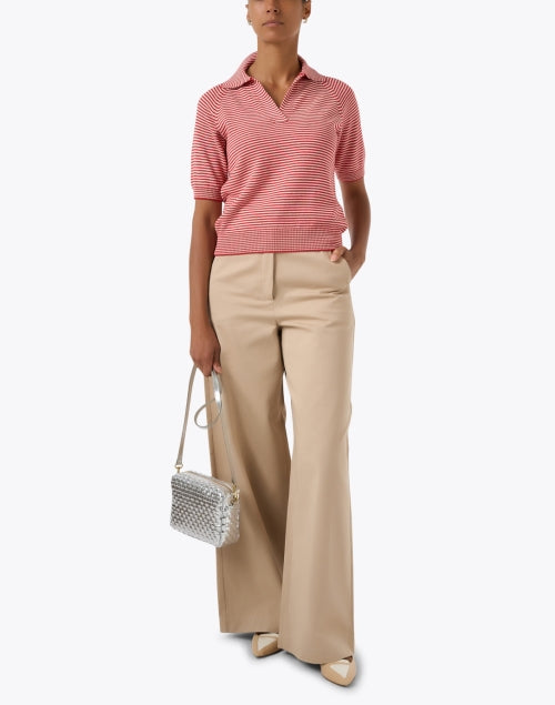 The Weekend Max Mara Junior top delivers effortless charm with its red and white micro-stripe pattern and vintage-inspired polo collar. Crafted from a lightweight knit, it features short sleeves and ribbed detailing at the hem for a refined finish. This relaxed yet polished top is perfect for pairing with everything from tailored trousers to weekend denim.