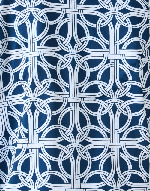 The Gretchen Scott navy print twist top adds a modern twist - literally - to the classic button-down with its flattering front knot detail. Designed with a geometric lattice print in crisp navy and white, it features a collared neckline, 3/4-length sleeves, and a tailored fit for polished versatility. Perfect for pairing with white pants or skirts, this top offers effortless sophistication with a flair.